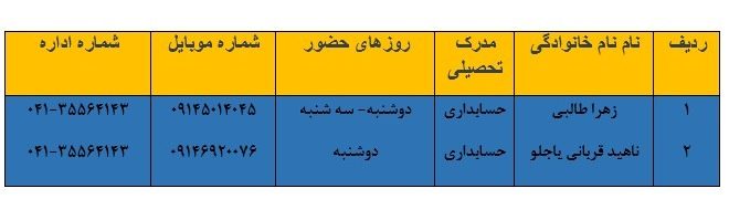 لیست سرگروه و اعضای گروه حسابداری مالی شاخه کاردانش استان آذربایجان شرقی سال تحصیلی ۱۴۰۵-۱۴۰۴ ردیف نام نام خانوادگی مدرک تحصیلی روزهای حضور شماره موبایل ۱ زهرا طالبی حسابداری دوشنبه – سه شنبه ۰۹۱۴۵۰۱۴۰۴۵ ۲ ناهید قربانی یاجلو حسابداری دوشنبه ۰۹۱۴۶۹۲۰۰۷۶